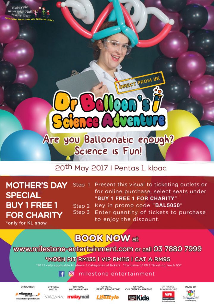 Buy 1 Free 1 For Charity . This promo is in conjunction with Mother’s Day (12 May onwards) and only applicable to KL shows on Mosh Pit, VIP and Cat A ticket category. Substantial amount from the sale will go to The Lost Food Project.