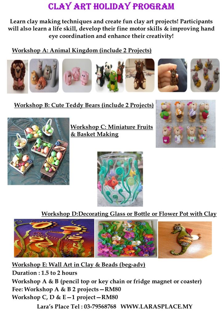 * Clay Art A -animal kingdom, B-cute teddy bears ,C-garden and bugs, D-clay on glass RM 80 or RM300 (4 workshops) 10am-12pm June 18-22